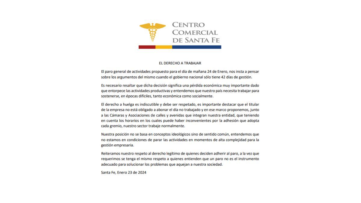 El Centro Comercial de Santa Fe mostró su desacuerdo respecto al paro general impulsado por la CGT para el próximo miércoles 24 de enero e instó a los comerciantes a "trabajar normalmente".