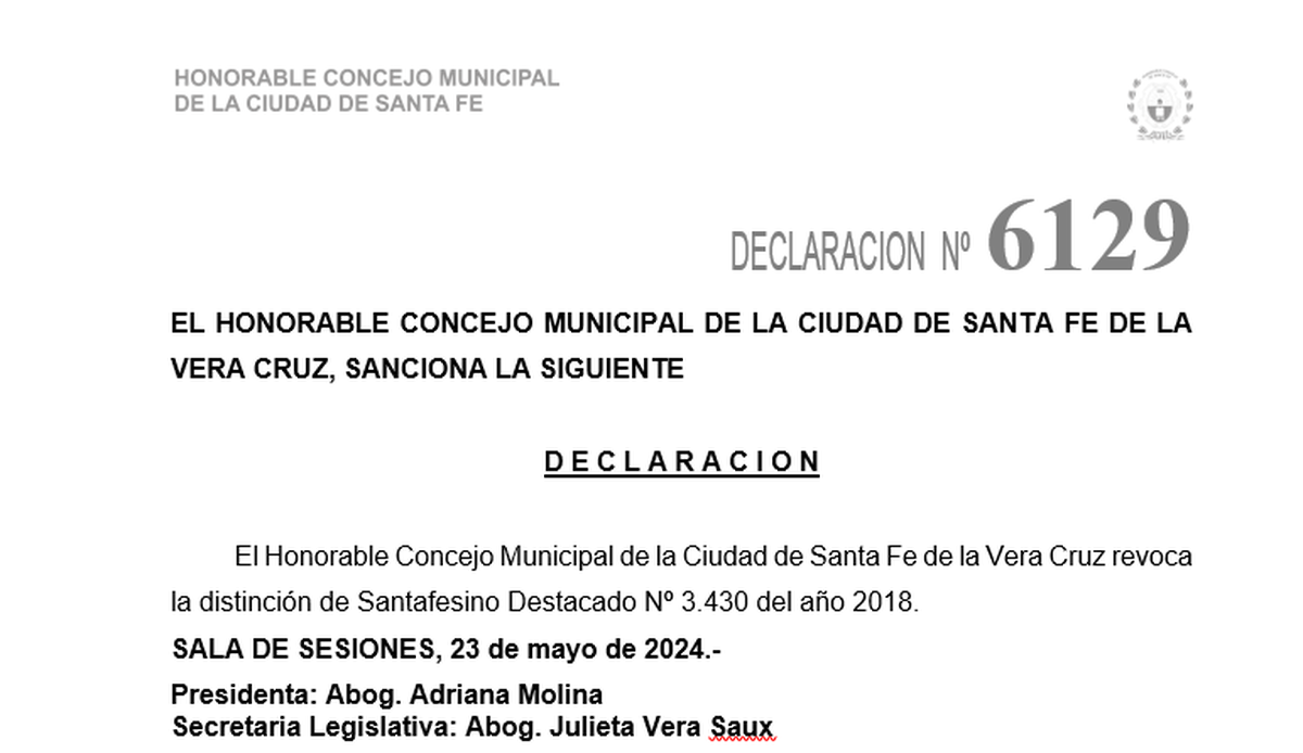 Por unanimidad, el Concejo Municipal decidió que Cobre ya no sea Santafesino Destacado