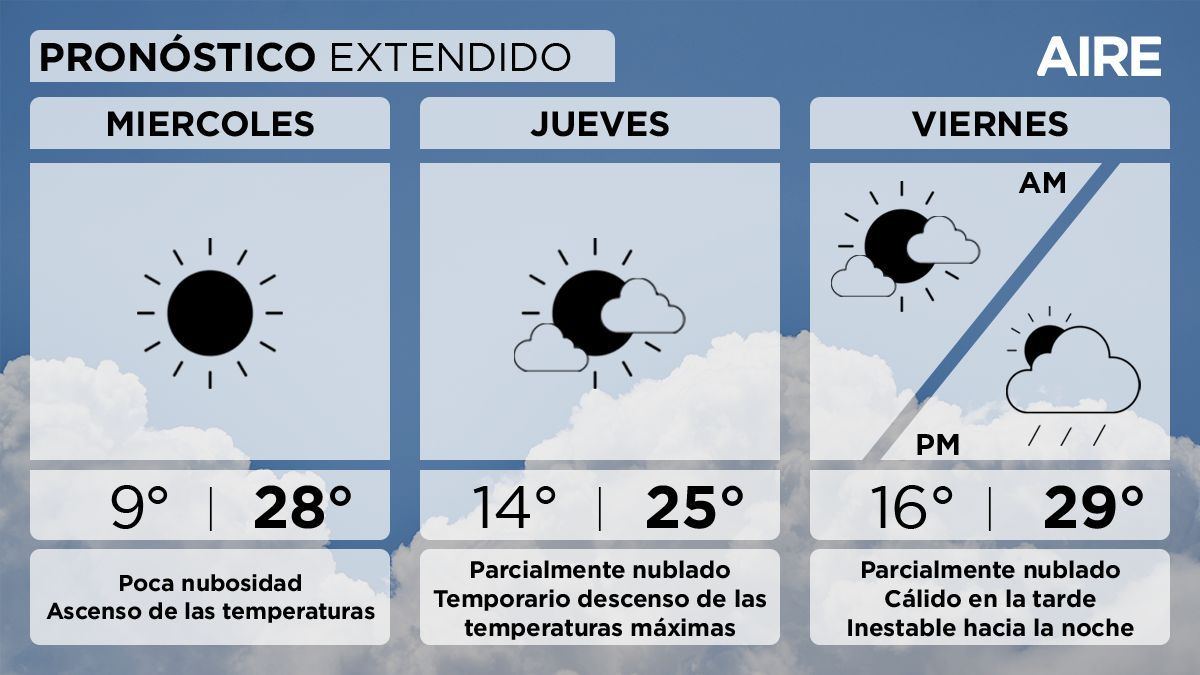 - Jueves: cielo parcialmente nublado. Temperatura mínima de 14°, máxima de 25° y viento leve a moderado del sudeste.