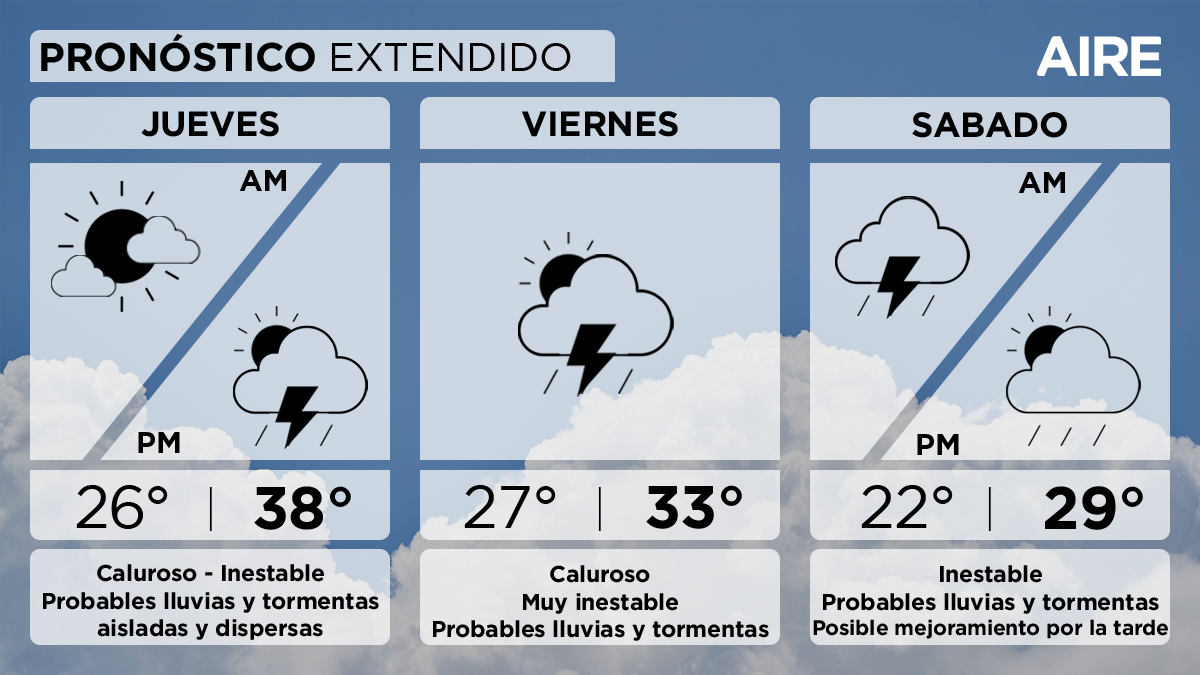 Para el sábado se espera un comienzo de jornada con condiciones muy inestables, siendo probables lluvias y tormentas. Sin embargo, da la posibilidad de que haya un mejoramiento temporario hacia la noche.