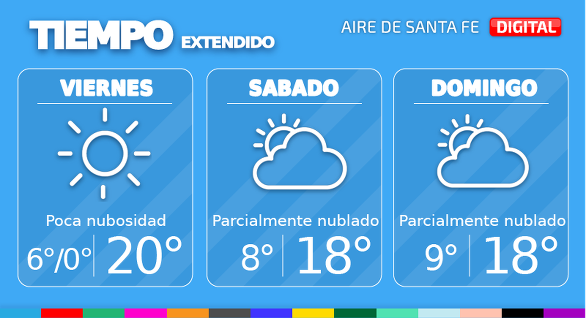 El sábado habrá cielo parcialmente nublado. Temperatura mínima de 8°, máxima de 18° y viento leve del este. Por otra parte, el domingo continuaremos con cielo parcialmente nublado. Temperatura mínima de 9°, máxima de 18° y viento leve del sudeste.