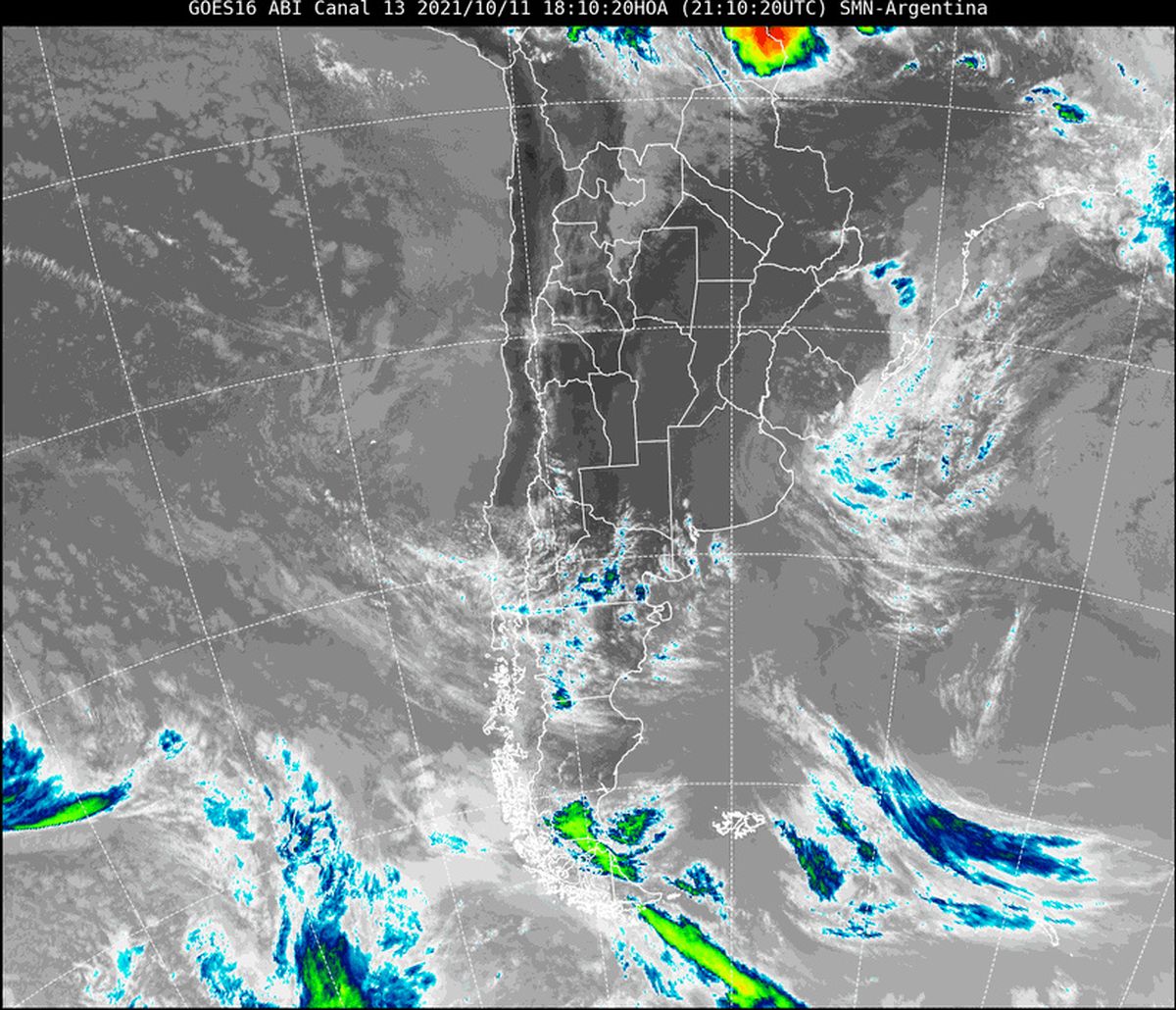 En la imagen satelital se observa cielo despejado prácticamente en toda la provincia de Santa Fe. Estas condiciones se mantendrán durante la jornada del lunes, con poco cambio en los valores térmicos. Sin embargo, se visualiza la nubosidad que va generando por delante el frente de aire frío que avanza desde el sur, sobre las provincias de Neuquén y Río Negro.