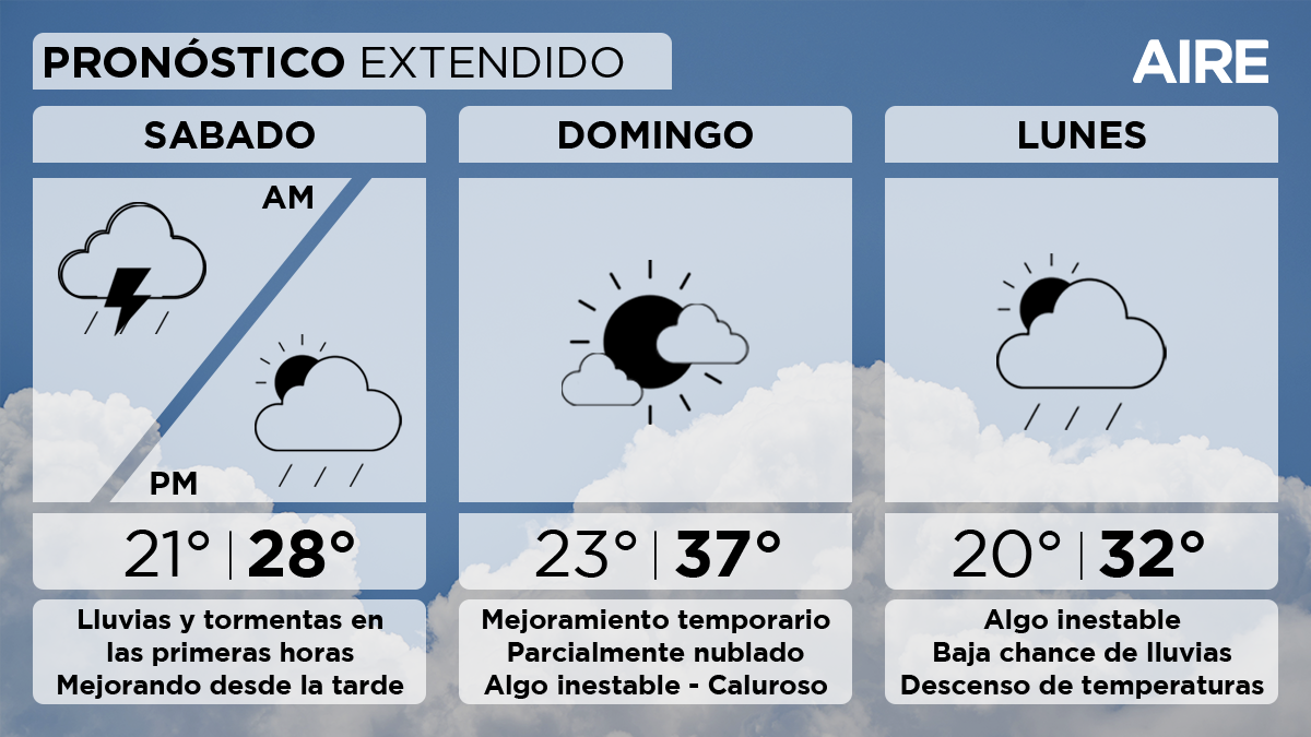 Para el domingo se pronostica un día con cielo algo a parcialmente nublado. Mínima de 23° y máxima de 37°. Viento leve a moderado del sur con ráfagas de mayor intensidad.