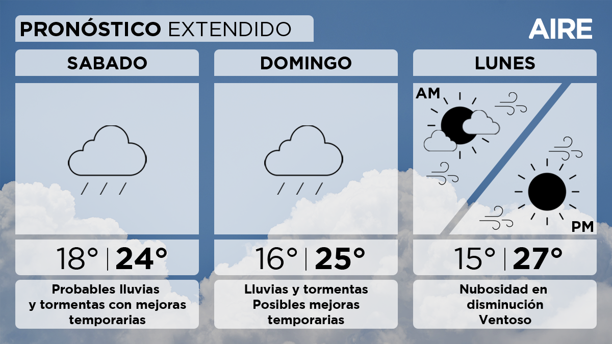 El domingo continuará con condiciones inestables. Se esperan lluvias y tormentas alternadas con posibles mejoramientos temporarios. Temperatura mínima de 16°, máxima de 25° y viento leve del sur rotando a moderado del sudoeste con ráfagas de mayor intensidad.