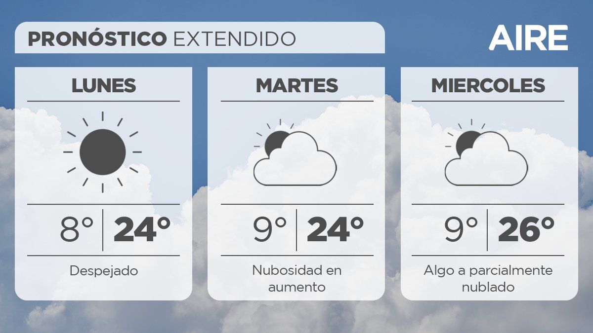 El miércoles el cielo estará algo a parcialmente nublado. Temperatura mínima de 9°, máxima de 26° y viento leve del sur.