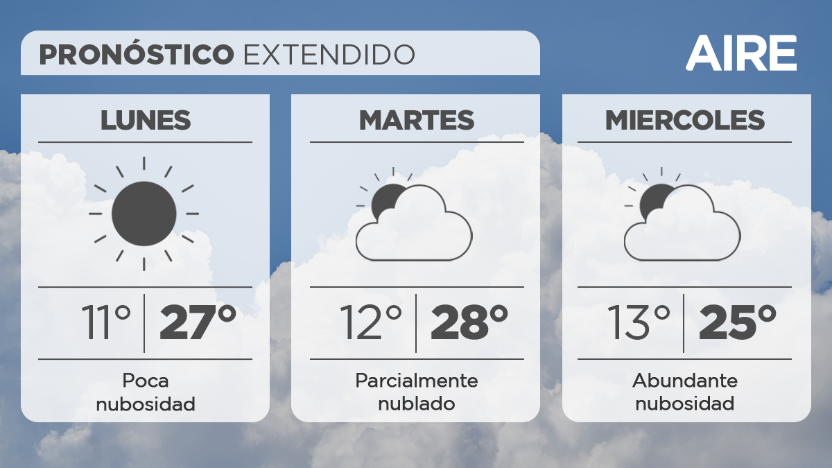 El miércoles continuará el cielo con abundante nubosidad. Temperatura mínima de 13°, máxima de 25° y viento leve a moderado del sudeste.