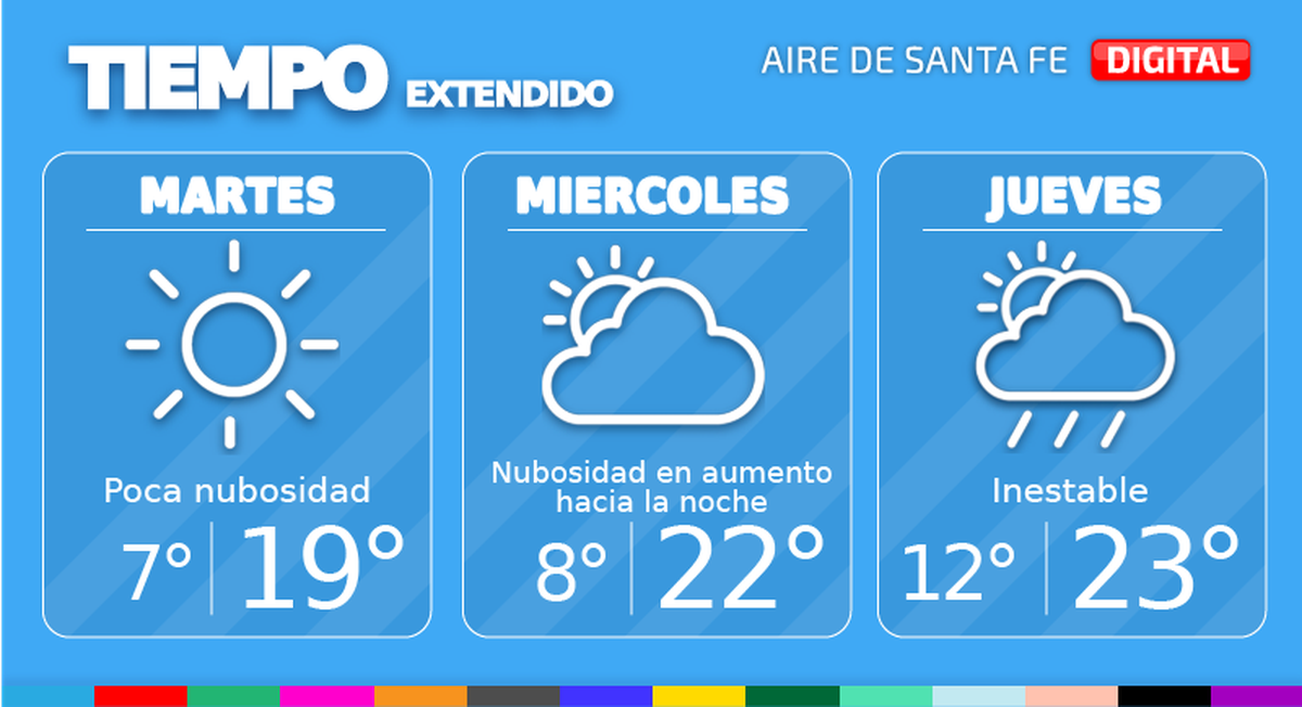 La semana comenzó con temperaturas agradables y despejado en la ciudad de Santa Fe. En este contexto, el martes continuará con poca nubosidad. Temperatura mínima de 7°, máxima de 19° y viento leve del sudeste rotando al noreste. El miércoles el cielo estará despejado, pero con nubosidad en aumento hacia la noche. Temperatura mínima de 8°, máxima de 22° y viento leve del noreste.