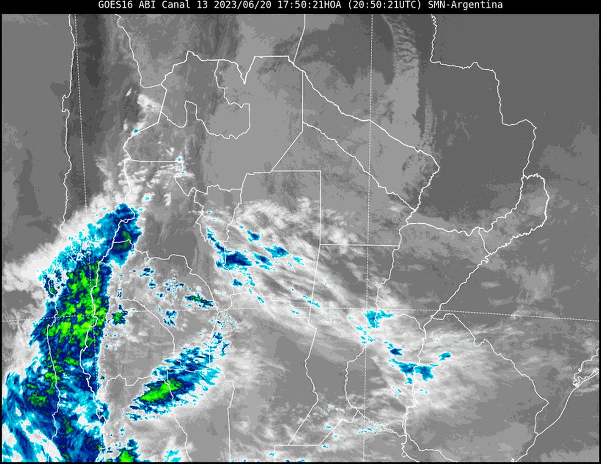 En la imagen satelital se observa abundante nubosidad en toda la mitad norte del país, incluida la provincia de Santa Fe. Esta situación se extenderá en los próximos días, con mayores probabilidades de algunas precipitaciones durante este miércoles, primer día del invierno. Las temperaturas tendrán poco cambio hasta la rotación del viento al noreste, lo que ocurrirá durante el jueves.