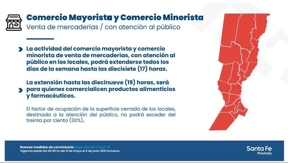 Los comercios no esenciales volverán a estar autorizados para atender a sus clientes hasta las 17, mientras los esenciales (farmacias, venta de alimentos, etc.) podrán mantener sus puertas abiertas hasta las 19. Las despensas o kioscos de barrio y los supermercados también abrirán hasta las 19.