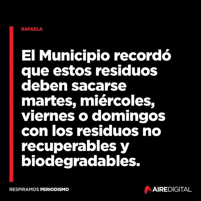 Estos residuos deben sacarse martes, miércoles, viernes o domingo con los residuos no recuperables y biodegradables. Los residuos que se recolectan estos días van directo a celda de enterramiento del Complejo Ambiental, sin que exista apertura de bolsa ni separación de materiales. Nunca deben sacarse las bolsas los lunes o jueves, aunque contengan material recuperable.