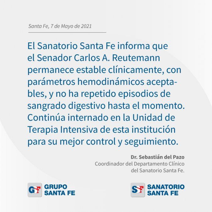 El informe que lleva la firma del Dr. Sebastián Del Pazo, coordinador del departamento clínico del Sanatorio Santa Fe, señala que Reutemann "permanece estable clínicamente" y "con parámetros hemodinámicos aceptables", por lo que el expiloto de Fórmula 1 sigue internado en terapia intensiva "para su mejor control y seguimiento".