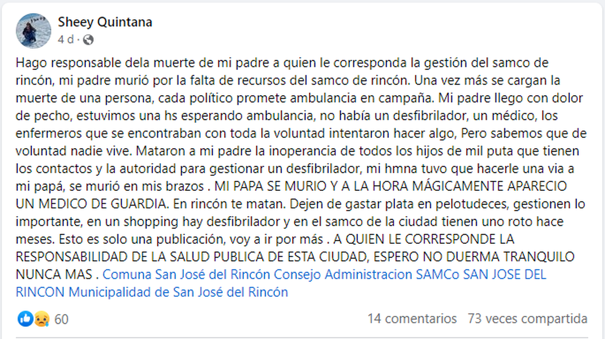 Juan fue trasladado al Samco de Rincón el miércoles 10 de abril a las 17.40 con un fuerte dolor en el pecho. Estuvo sentado en una silla esperando que llegue un médico a asistirlo. Según contó su hija, estaban esperando que arribe una ambulancia que llevaría un médico para que lo viera, pero el vehículo no llegó a tiempo.