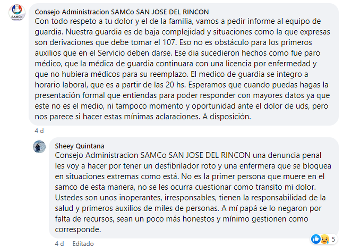 Juan Quintana, vecino de San José del Rincón, fue trasladado el miércoles 10 de abril al Samco de la ciudad por una descompensación. En el centro de salud lo recibieron dos enfermeros y una asistente social, ya que no había médico de guardia. El hombre, que padecía un fuerte dolor en el pecho, sufrió un paro cardiorrespiratorio y murió momentos después de llegar al efector.