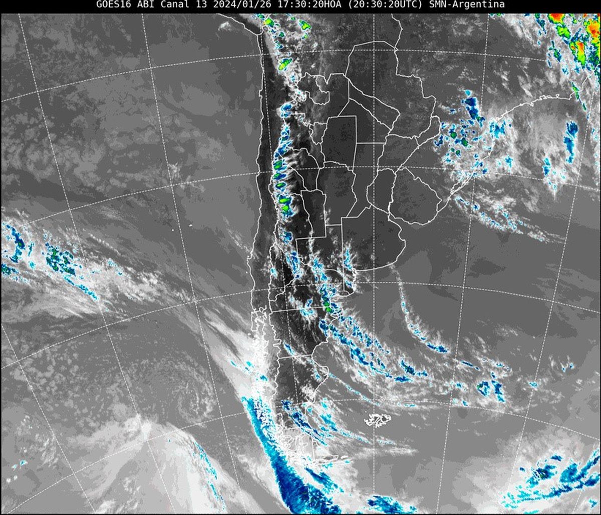 En la imagen satelital se observa que la situación continúa sin cambios respecto a los días anteriores. El territorio nacional se halla libre de nubes, aunque poco a poco en las provincias de Neuquén, La Pampa y oeste de Buenos Aires va formándose nubosidad. Esto se debe a que la zona de altas presiones ya se va desplazando al océano Atlántico y permite que comience a ingresar aire más frío en altura desde el sur.