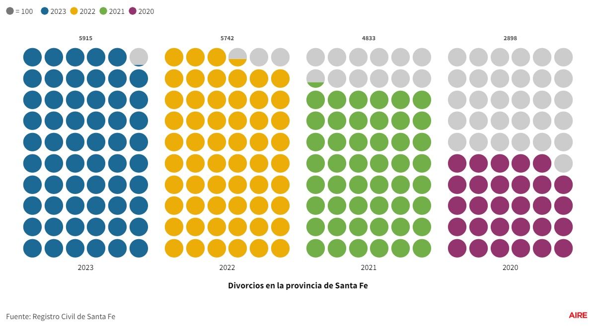 En cambio, en 2023 volvió a crecer el número de divorcios y alcanzó los 5.915, una cifra que representa un incremento del 3 por ciento respecto al año anterior que tuvo 5.742. Estos datos consolidan la tendencia en alza que se viene dando desde el 2020, donde hubo apenas 2.896 disoluciones matrimoniales, a raíz de las restricciones impuestas por la pandemia.