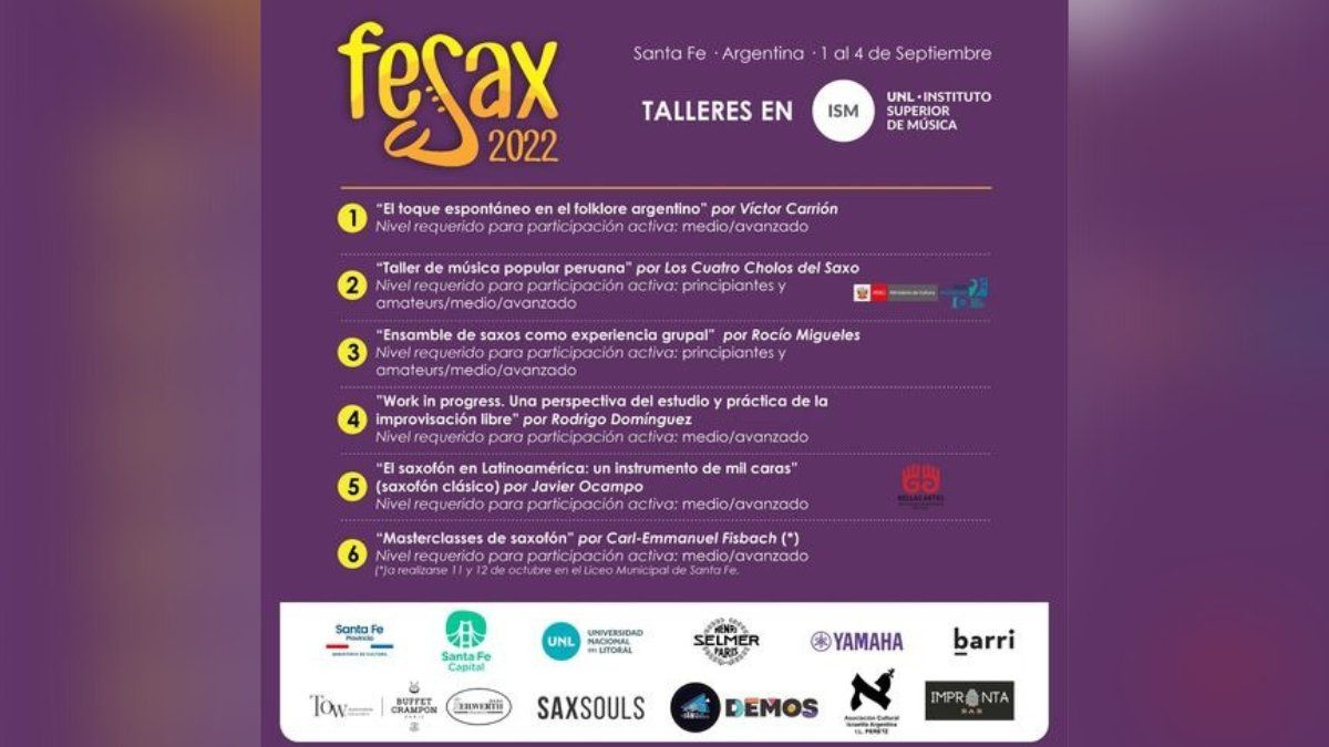 Domingo 4 de Septiembre. 17Hs. Mercado Progreso de la Ciudad de Santa Fe (Balcarce 1625); entrada libre y gratuita. Se presentarán el “Ensambles de Saxos de FeSax 2022” dirigido por la Profesora Rocío Migueles, el grupo Barro y la Fanfarria Ambulante.