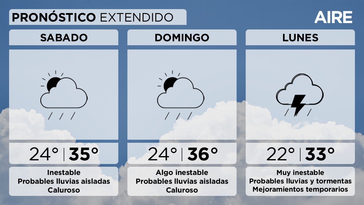 El lunes las condiciones serán más inestables, esperando lluvias y tormentas con mejoramientos temporarios. Temperatura mínima de 22°, máxima de 33° y viento leve a moderado del norte rotando al sudeste.