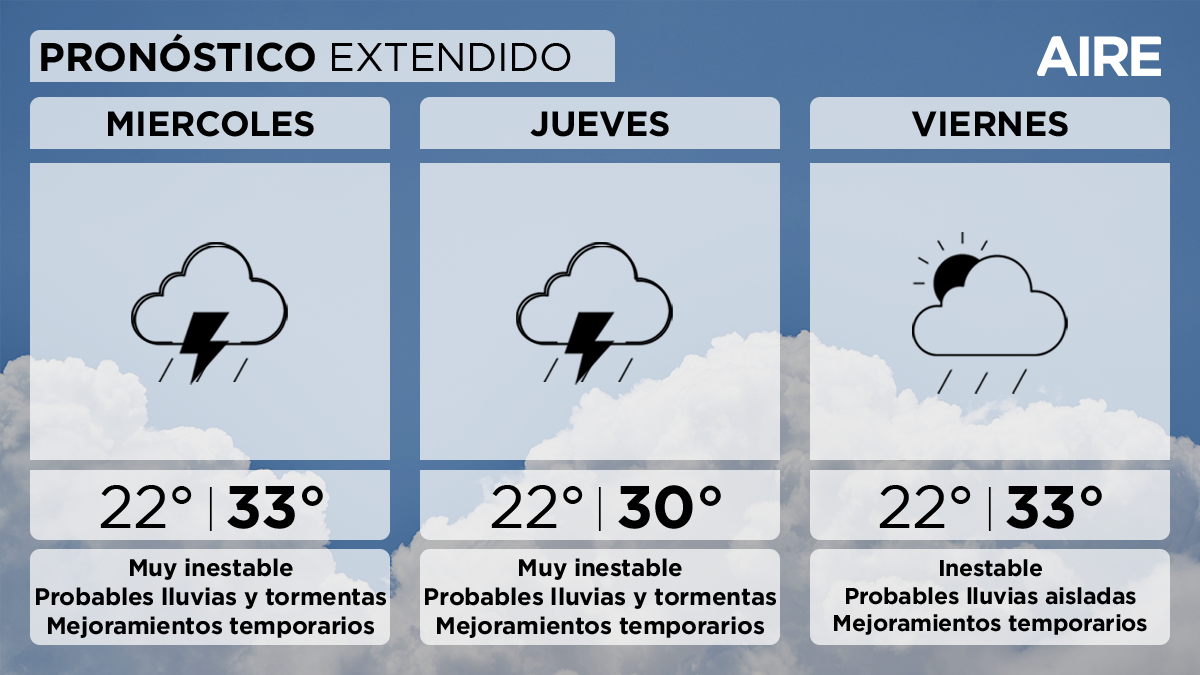 El jueves también serán inestables las condiciones, con probables lluvias y tormentas aisladas, alternadas con mejoramientos temporarios. Temperatura mínima de 22°, máxima de 30° y viento leve a moderado del este rotando al sudeste.