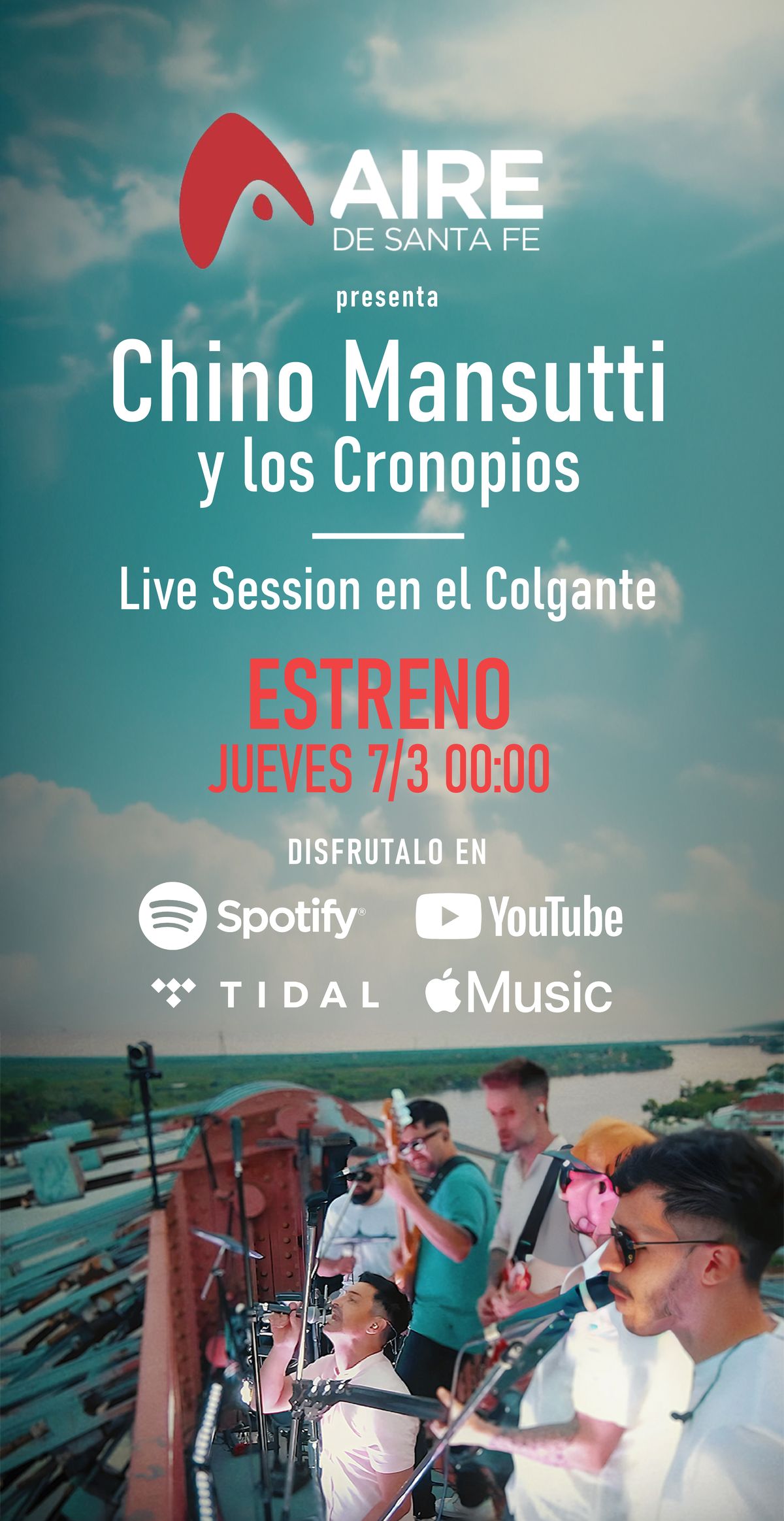 A mediados de noviembre, mientras la ciudad de Santa Fe se preparaba para festejar los 450 años de su fundación, seis músicos santafesinos treparon a la torre oeste del Puente Colgante e interpretaron cinco canciones mientras el sol caía a sus espaldas. Chino Mansutti y Los Cronopios culminó con este show histórico la presentación de su último disco, Para Bien. Ahora, se preparan para estrenar la grabación de lo que fue ese histórico show.