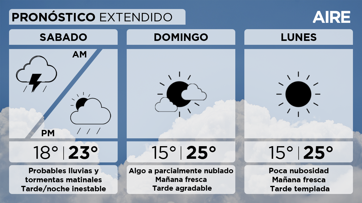 Sin embargo, la inestabilidad estará presente hasta el final del día, haciendo que los mejoramientos puedan ser temporarios y se presenten algunas precipitaciones aisladas en el proceso. También habrá un importante descenso de las temperaturas. Se prevé una temperatura mínima de 18°, una máxima de 23° y viento leve a moderado del sur con probables ráfagas fuertes.