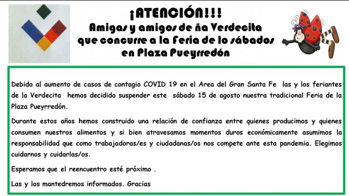 La feria de La Verdecita en la Plaza Pueyrredón de Santa Fe se suspende este sábado 15 de agosto ante el aumento de los casos de coronavirus en el Gran Santa Fe. Los feriantes no van a vender verduras y hortalizas en la plaza para evitar riesgos. Es importante recordar que buena parte de las verduras que se consumen en la ciudad provienen de las quintas de Monte Vera (también de Recreo), el principal foco de covid del Gran Santa Fe.