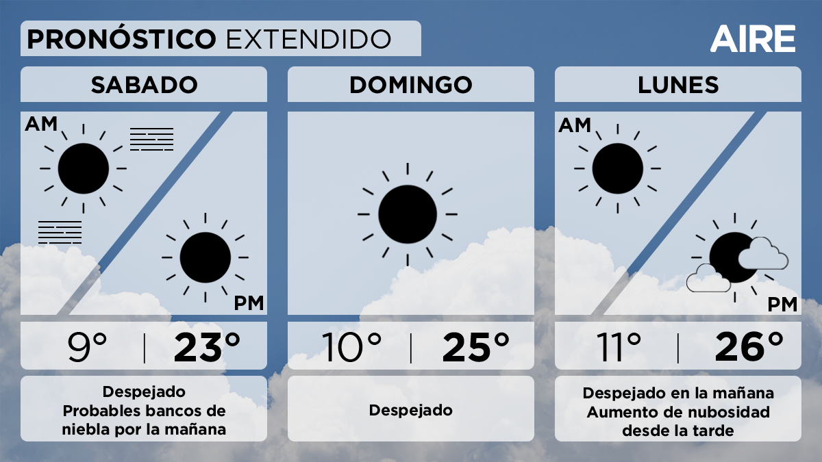 Lunes: El día comenzará con cielo despejado, pero la nubosidad aumentará hacia la tarde. Las temperaturas variarán entre una mínima de 11°C y una máxima de 26°C. Se espera viento leve a moderado del noreste.