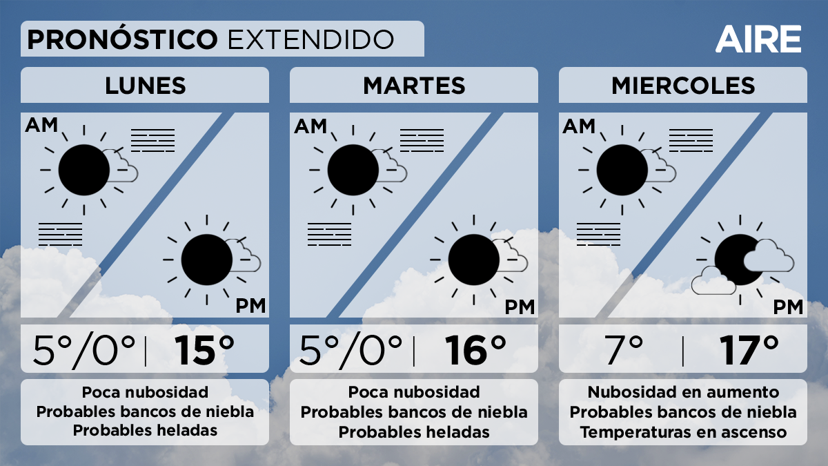El martes continuará con cielo despejado, con una temperatura mínima de 5° en zona urbana, 0° con probables heladas en zonas con poca edificación, si el viento queda en calma y el cielo despejado en la madrugada, y una máxima de 16°, con viento leve del sudeste rotando al este.