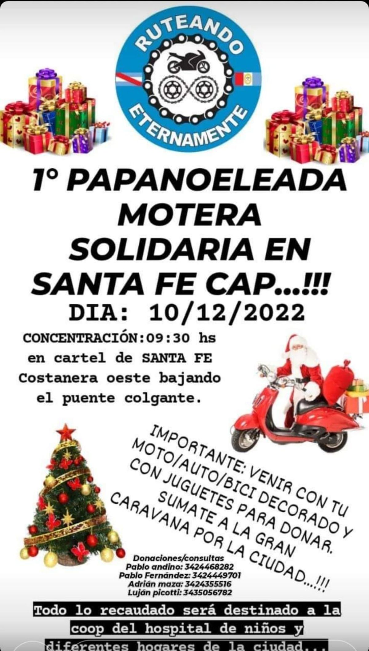 5. Otra opción será la 1° Papanoeleada Motera, que se realizará en nuestra ciudad el próximo 10 de diciembre. La convocatoria es realizada por un grupo de amigos santafesinos que proponen juntar obsequios y llevarlos en caravana de motos y autos decorados con motivos navideños hasta el Alassia, ya que la organización receptora será la Cooperadora del Hospital. Convocan a sumarse desde las 9.30 en las letras de la palabra Santa Fe de la Costanera, para salir en caravana hasta el Faro, pegar la vuelta por la Costanera y seguir por Alem hasta calle Salta para arribar al nosocomio.