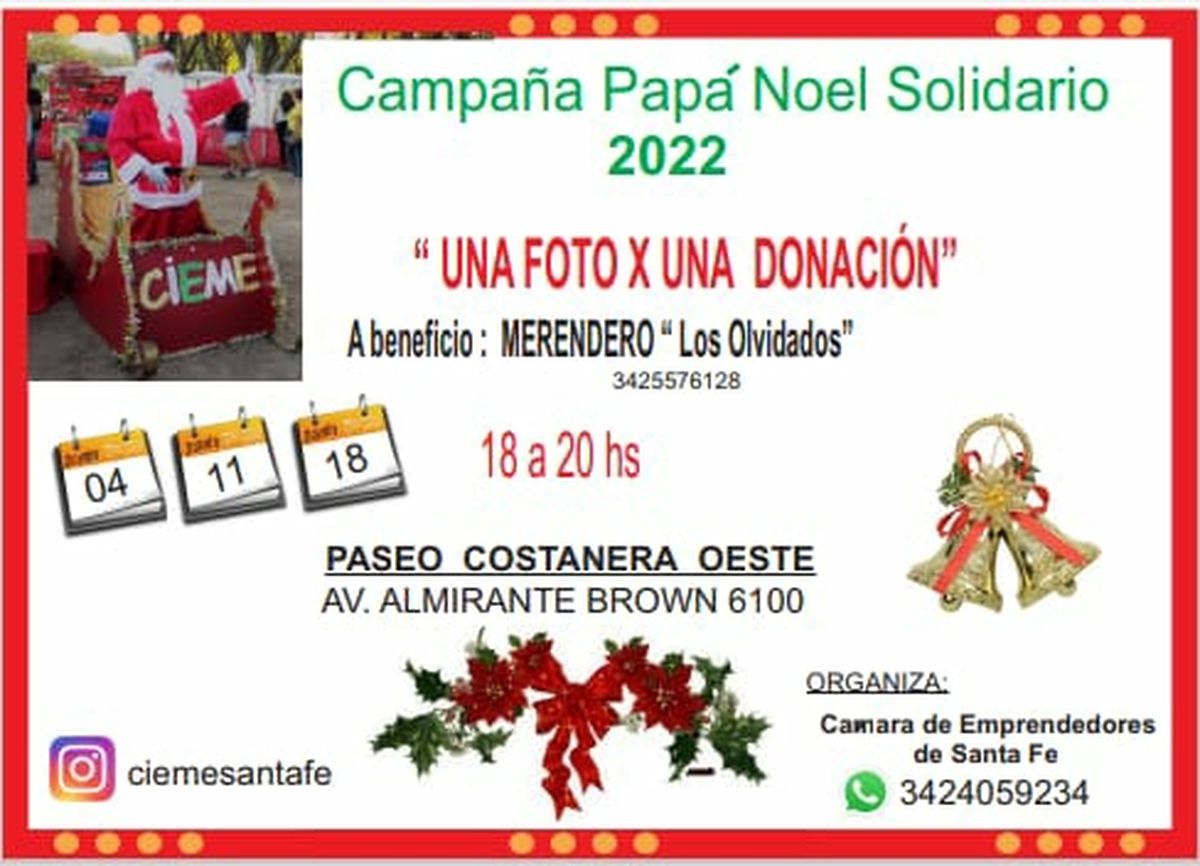 2. La Cámara de Emprendedores y Microempresas invita como todos los años a sacarse una foto con Papá Noel a cambio de una donación (juguetes, pañales, ropa, calzado, alimentos). Estarán el próximo domingo 11 y 18 de diciembre, de 18 a 20, en la feria ubicada en Almirante Brown 5800 (Costanera Oeste). Lo recolectado se entregará al merendero “Los Olvidados” del barrio Santa Rosa de Lima, espacio impulsado por tres madres del barrio que asisten a diario a cerca de 100 niños. Cabe destacar que esta es la 12° edición de esta campaña, que ya está en marcha desde principios de este mes. La entrega de lo recaudado se realizará en bolsones que llevará el mismo Papá Noel al barrio en días previos a la Navidad. También Papá Noel estará el 11 de diciembre en el Molino Fábrica Cultural, desde las 16 a las 20.30, también con la misma propuesta y objetivo de recaudación.