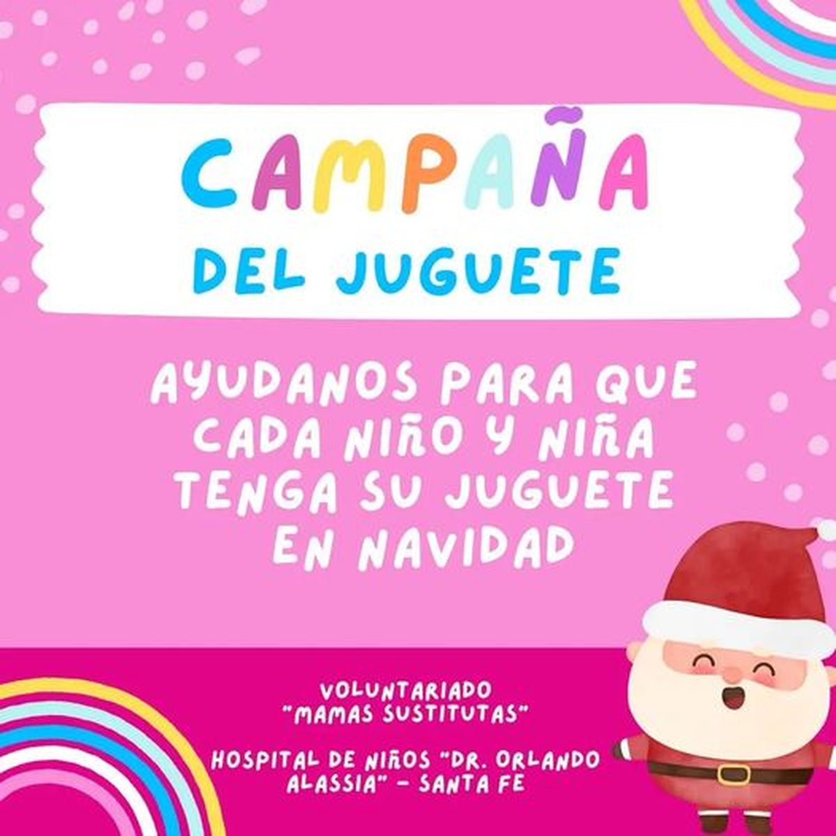 Este mismo hospital, por otro lado, tiene otra organización que está juntando juguetes: las Madres Sustitutas del Alassia, que proponen “llenar el hospital de sonrisas”. Solicitan obsequios para niños y niñas de 0 a 14 años, nuevos y de fácil limpieza (material plástico, cartón o madera porosa). Recibirán las donaciones las voluntarias, para coordinar, solicitan que les escriban a este Facebook.
