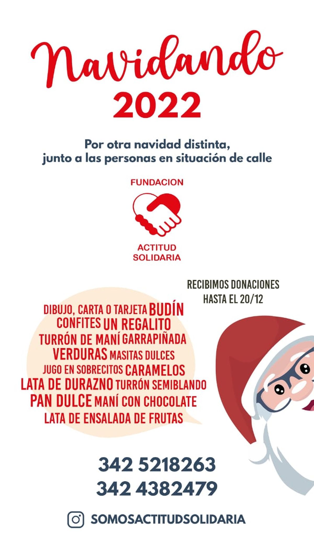 3. La Fundación Actitud Solidaria prepara como todos los años canastas navideñas para personas en situación de calle. En esta oportunidad están pidiendo turrones semiblandos, garrapiñadas, budines, pan dulce, jugos en sobrecito, verduras, latas de durazno, juguetes, tarjetas o cartitas. Quienes quieran colaborar pueden comunicarse a los teléfonos: 3425218263; 3424382479; o mediante a su página de Facebook.