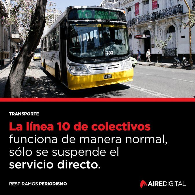El servicio directo de la línea 10 de colectivos quedó suspendido por tiempo indeterminado, informaron desde la empresa Autobuses Santa Fe. En tanto, la línea 10 que ingresa a los barrios limítrofes de la Avenida Aristóbulo del Valle, continuará con el habitual recorrido.