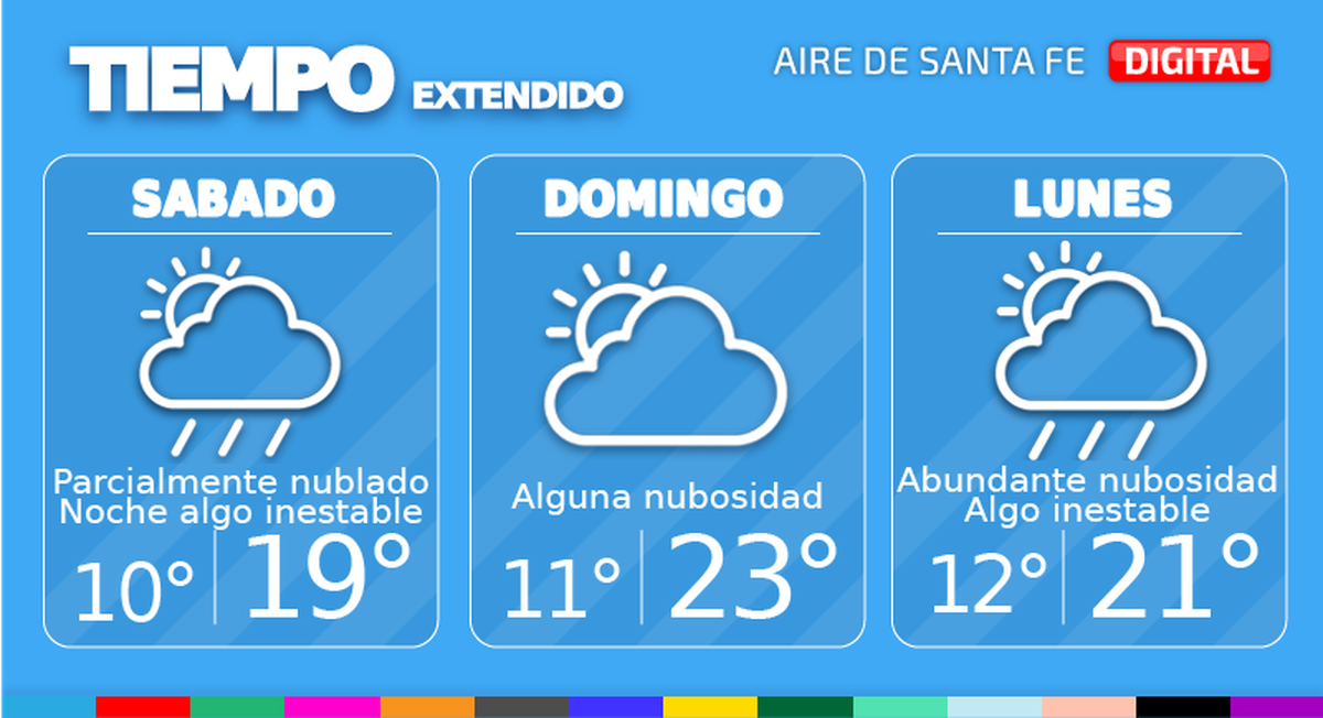 El domingo cielo con alguna nubosidad. Temperatura mínima de 11°, máxima de 23° y viento leve del sudeste. El lunes nuevamente tendremos el cielo con abundante nubosidad y condiciones algo inestables. Temperatura mínima de 12°, máxima de 21° y viento leve a moderado del sudeste.