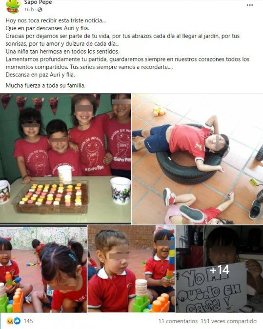 "Hoy nos toca recibir esta triste noticia. Que en paz descanses Auri y flia. Gracias por dejarnos ser parte de tu vida, por tus abrazos cada día al llegar al jardín, por tus sonrisas, por tu amor y dulzura de cada día", escribieron las docentes en un posteo de Facebook, en el que adjuntaron imágenes de la nena jugando con sus compañeritos.