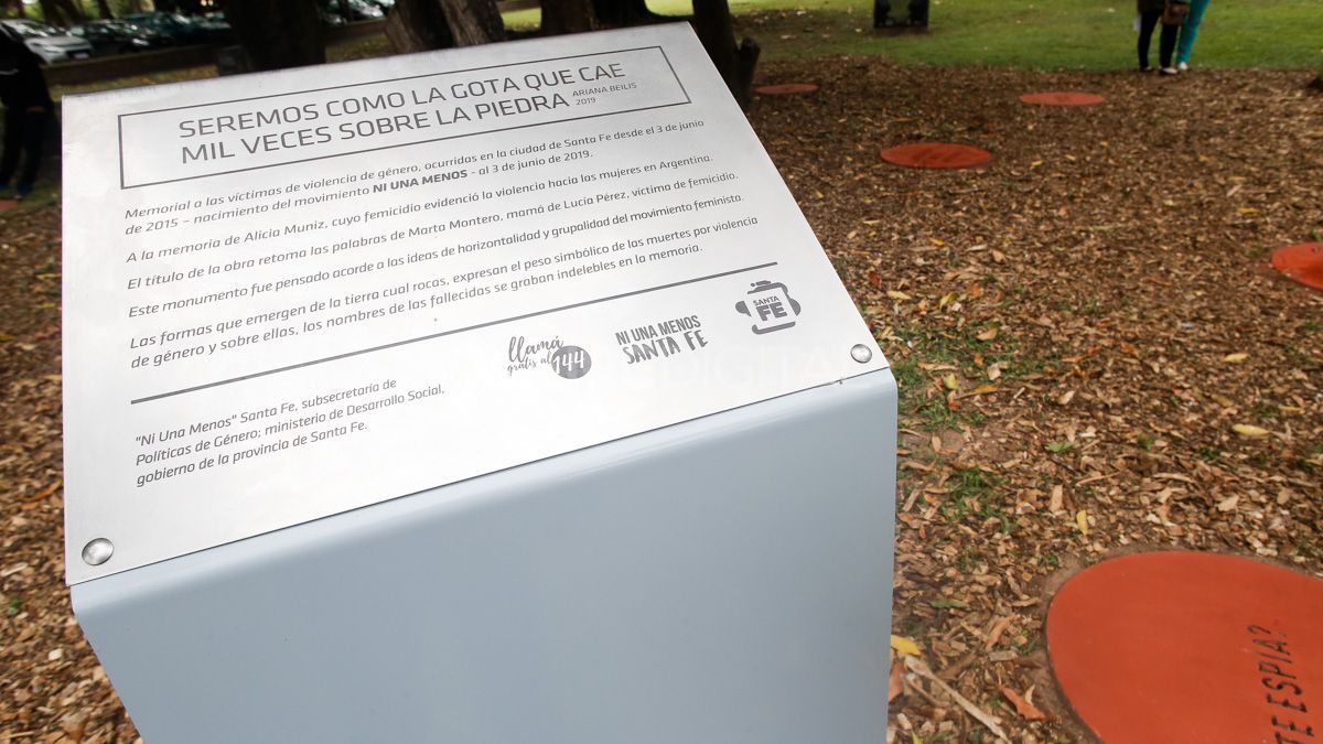 “Este monumento fue pensado acorde a las ideas de horizontalidad y grupalidad del movimiento feminista. Las formas, que emergen de la tierra cual rocas, simbolizan el peso de las muertes por violencia de género. Sobre ellas están los nombres de las fallecidas que se graban indelebles en nuestra memoria”, explica la artista.