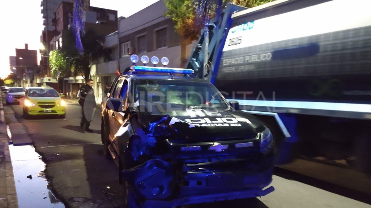 El móvil policial circulaba de este a oeste y chocó al vehículo comercial Fiat Ducato que se encontraba estacionado. Por el fuerte impacto, la camioneta terminó arriba de la vereda de enfrente.
