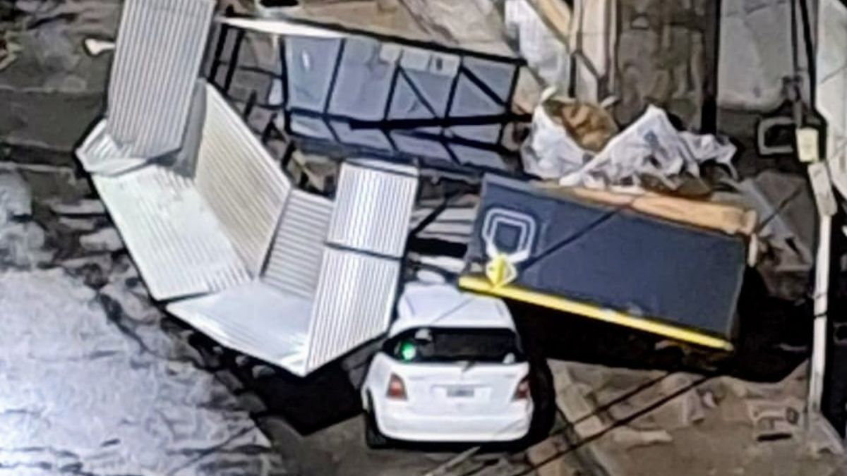 Las chapas se desprende y terminaron impactando contra un Mercedes Benz que estaba estacionado en la vereda. Afortunadamente, no se registraron heridos.