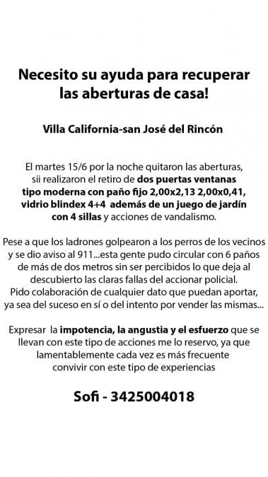 El miércoles 16 de junio, entre las 3 y las 4 , desconocidos entraron a robar a una vivienda a medio construir ubicada en Callejón Reina y Los Jazmines de Villa California. Se fueron con seis hojas de más de dos metros de vidrio templado y nadie vio nada. Unos vecinos llamaron al 911 porque ladraban los perros. Cuando la dueña llegó hasta la vivienda, los policías le dijeron que hay muchos robos en la zona y le recomendaron que "Busque ella, a ver si puede encontrar lo que le robaron".