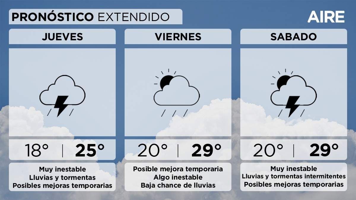 Jueves: Continuarán las condiciones muy inestables. Se esperan lluvias y tormentas durante gran parte de la jornada. Mínima: 18° / Máxima: 25°.