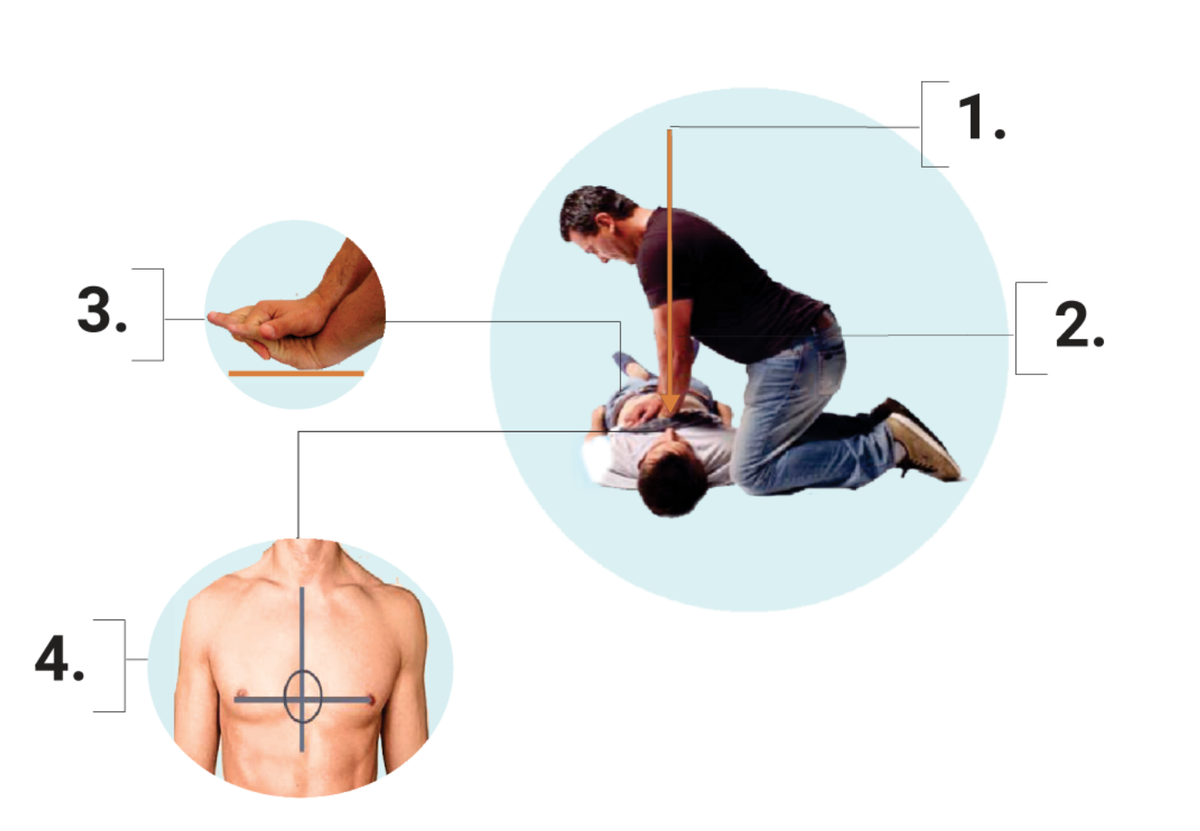 - Colocá los dedos índice y medio en el centro del esternón, entre los pezones, sin presionar en el extremo del esternón.