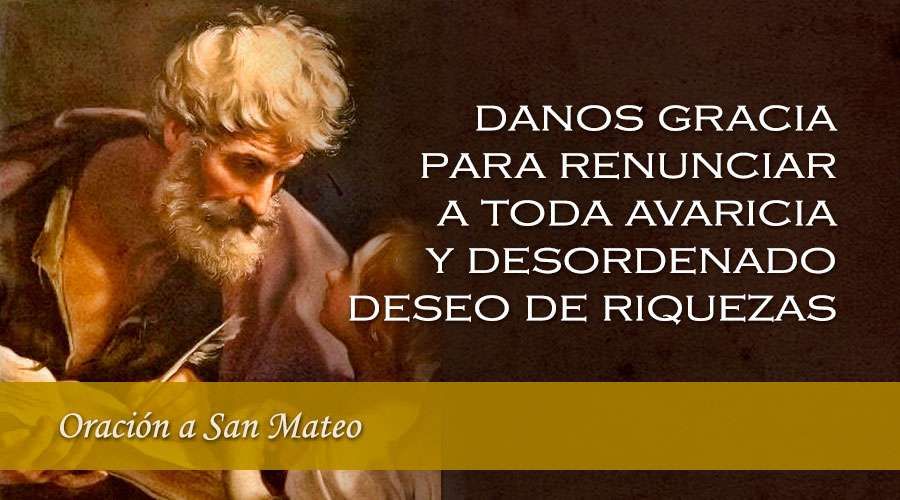 Dios, que por la boca de tu bendito Hijo llamaste a Mateo del banco de los tributos, para que de publicano se convirtiese en apóstol y evangelista, danos gracia para renunciar a toda avaricia y desordenado deseo de riquezas y para seguir al mismo Jesucristo, tu Hijo, que en unidad del Espíritu Santo, vive y reina contigo eternamente.