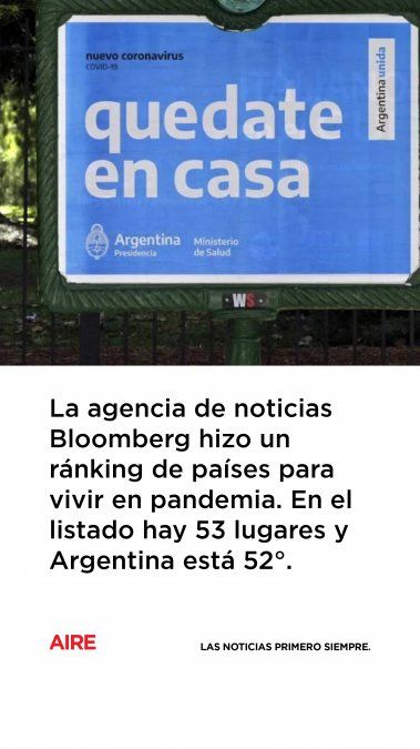 En ese ránking, Argentina ocupa el puesto 52º, es decir, el anteúltimo lugar. El peor país para vivir durante la pandemia, fue México. Perú, Chile, Colombia y Brasil quedaron por arriba de Argentina. Entre los mejores países quedaron Nueva Zelanda (85,4 puntos), Japón (85) y Taiwán (82,9).
