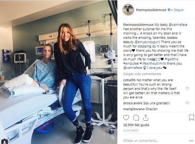 Junto a la imagen compartida en las redes sociales, Wasser escribió: “Mi querida @camraface tenía otra sorpresa para mí esta mañana… Alguien llamó a mi puerta y entró la increíble, talentosa, tremenda y bella @amypurdygurl! Muchas gracias por pasar a verme, ha significado muchísimo para mí. Gracias por mostrarme que la vida solo va a ir a mejor y que tengo mucha vida por vivir #lohelogrado #amputado #lavidasinlímites gracias @camraface Te amo”.