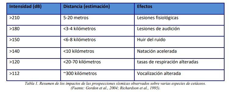 Para buscar hidrocarburos en la plataforma subacuática, las empresas petroleras utilizan maquinaria y métodos de exploración cuyos sonidos son comparables al despegue de un cohete o al ruido de armas militares y nucleares. Estos ruidos se propagan en el agua, donde los sonidos viajan cinco veces más rápido y con cinco veces mayor amplitud que en el aire.