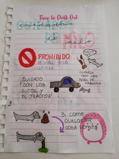 “Prohibido dejarlo solo afuera. Cuidado con los autos y el tractor. Guarda con las patas de caballo. Si come cualquier cosa vomita”, especificó la niña en la primer foto que compartió su tía. Además, en otra hoja la nena aclaró: “Cuidado con pisarlo. Tampoco le den sobras, también vomita. Milo no es un buen nadador. Come en la mañana, tarde y noche”.