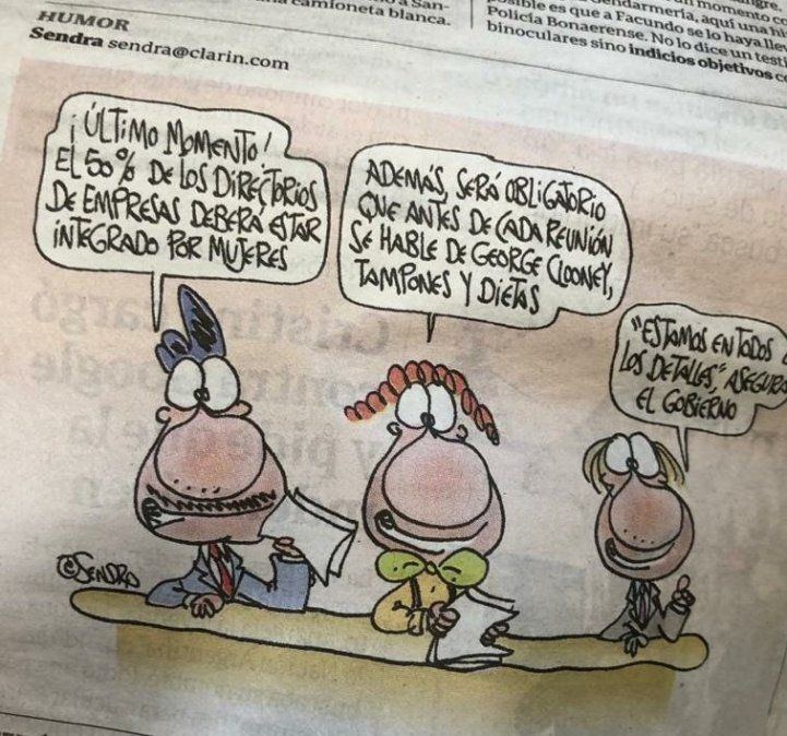 Apenas unos centímetros en la última página del diario -enmarcados dentro de la sección "Humor"-, bastaron para encender las alarmas de las lectoras que ya no pasan por alto este tipo de comentarios: "¡Último momento! El 50% de los directorios de empresas deberá estar integrado por mujeres. Además, será obligatorio que antes de cada reunión se hable de George Clooney, tampones y dietas. 'Estamos en todos los detalles', aseguró el Gobierno", informaban desde ese recuadro los tres simpatiquísimos personajes a los que Sendra dio voz. Pero era humor.