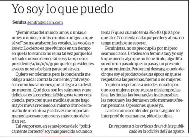 Pero esta ola de críticas tuvo como corolario un descargo del dibujante que, lejos poner paños fríos, recrudeció el fuego cruzado. Bajo el título "Yo soy lo que puedo", Sendra ensayó una especie de explicación de su historieta -no sin antes ironizar acerca del lenguaje inclusivo-, en la que le habla directamente al colectivo feminista y se excusa diciendo que él es "lo que puede".