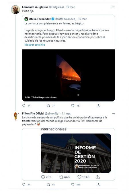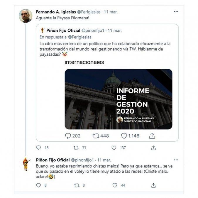 "Piñón Fijo". Lo que derivó en la reacción del payaso cordobés que no dudó en dirigirse al diputado. "La cifra más certera de un político que ha colaborado eficazmente a la transformación del mundo real gestionando vía TW. Háblenme de payasadas", disparó el ídolo infantil junto con un breve informe de gestión 2020 del político que resumía: "7 proyectos de ley - 39 proyectos generales- 152 acompañamientos 18 sesiones - 77 votaciones - 66 reuniones de comisión 4 reuniones presidiendo la Comisión del Mercosur 5 denuncias penales - 2 denuncias internacionales".