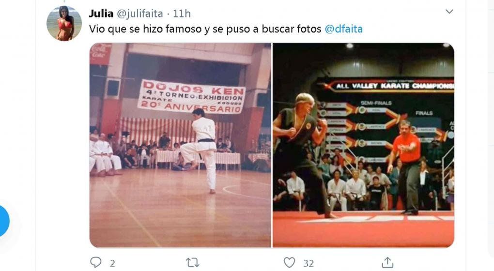 Su padre, Diego Faita, practicó karate en los ’80, en el Dojo Ken de Caballito. Ahora, a partir de la repercusión con Cobra Kai tras su llegada a Netflix, el hombre se puso a buscar fotos de su pasado como karateka, y su hija Juli no dejo pasar la oportunidad de comentarlo en sus redes.