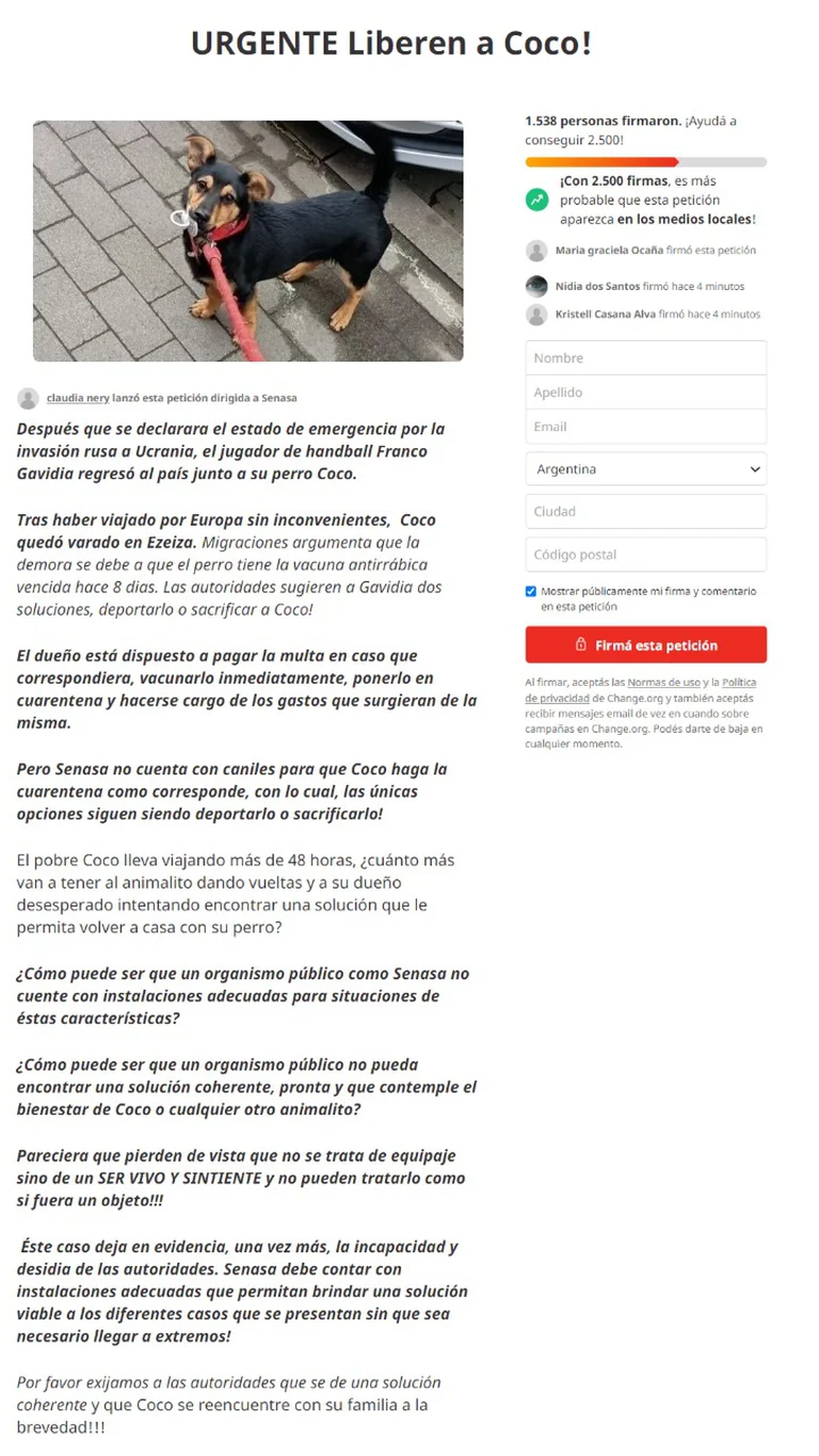 La situación pronto tomó estado publico y la imagen del cachorro de un año y medio “detenido” pronto se hicieron viral y desató una campaña solidaria que pedía por él: #LiberenACoco.